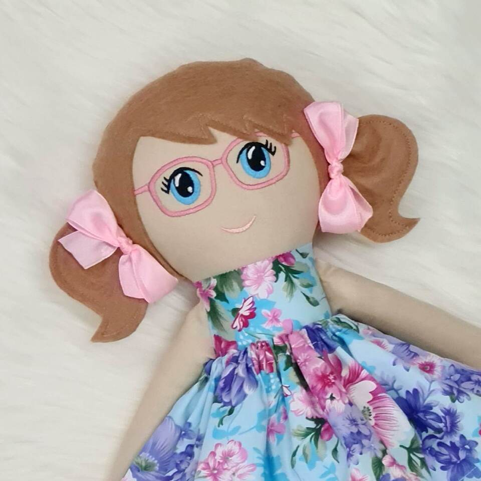 This doll features a machine embroidered glasses and represents children and individuals who wear them.