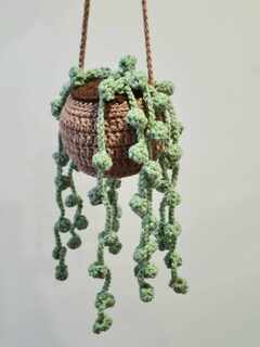 2 x Small Crocheted Hanging String of Pearl Plants - Pots are approx 8cms x 6cms. 2 different coloured green plants will be sent in brown pots.