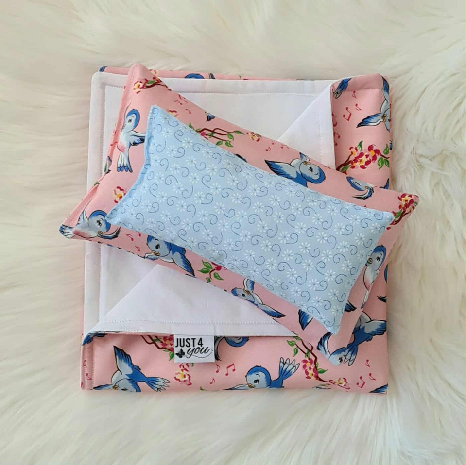 Dolls Bed, Cot or Pram Bedding Set - 3 Piece Blue Birds : consisting of blanket and 2 pillows.