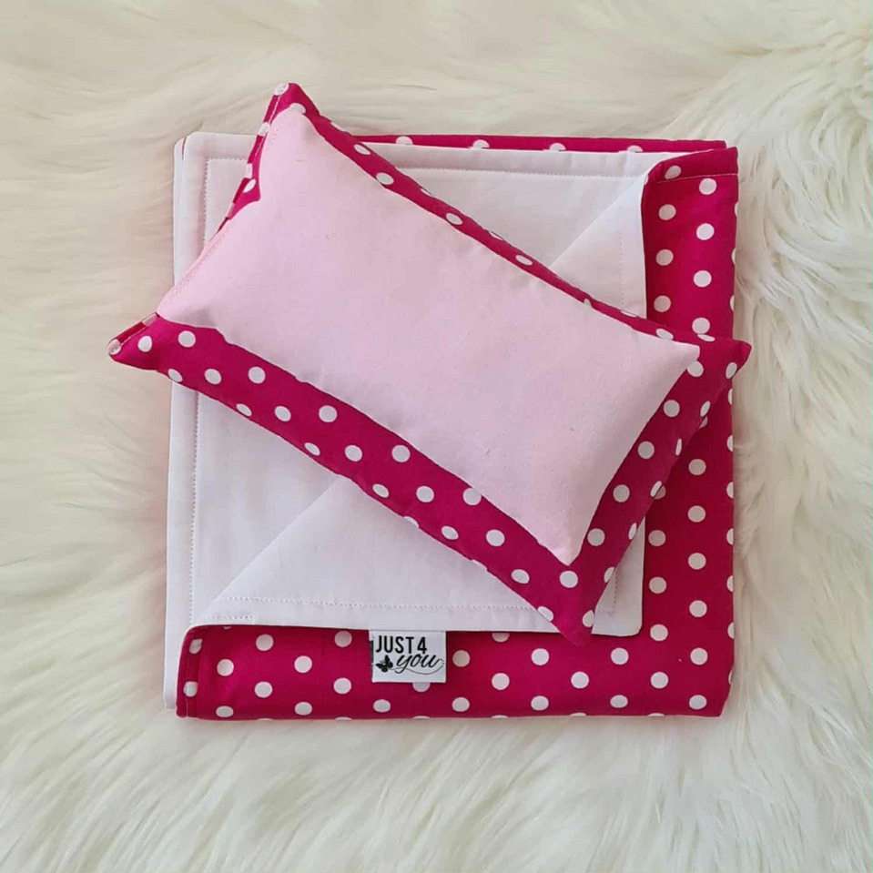 Dolls Bed, Cot or Pram Bedding Set - 3 Piece Pink Polka Dot : consisting of blanket and 2 pillows.